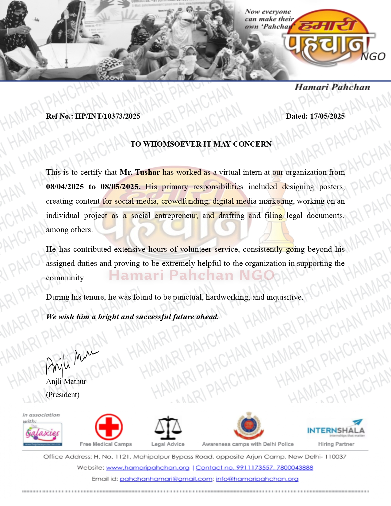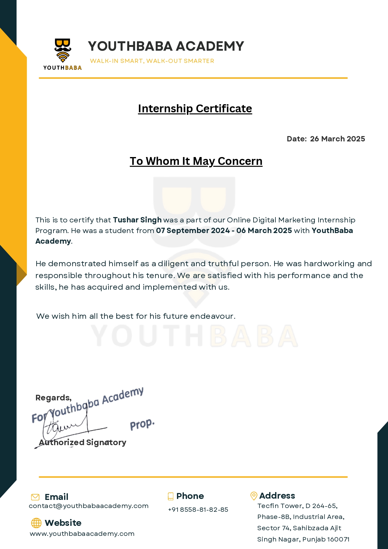 I'm Tushar, an Enthusiast Digital Marketer. contact@heytushar.com SEE MY PROJECTS Meet Tushar “Who recently completed a professional course and a 6-month internship. I specialize in optimizing online presence through SEO, social media strategies, and data-driven marketing techniques.” Experties. Search Engine Optimization Social Media Management Social Media Marketing Google Analytics Google Ads Email Marketing Certifications. SEE MY CERTIFICATE 01 SEE MY CERTIFICATE 02 Lets connect. Whatsapp Linkedin
